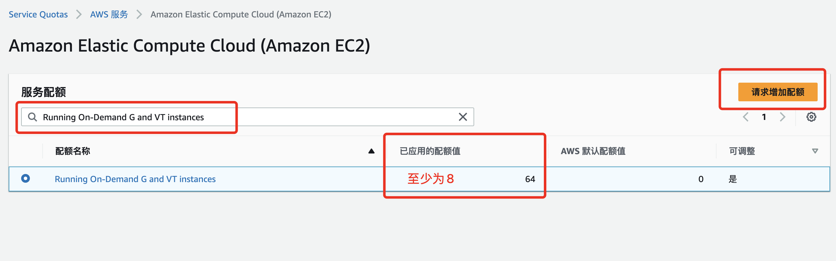 Running On-Demand G and VT instances 行,配额至少需要等于大于 8。若不足,需申请下配额。