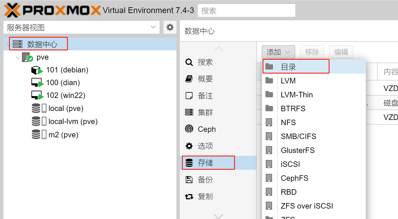 选择”数据中心”(这块一定要注意,不是选择PVE),存储 - 添加 - 目录
